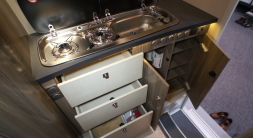 清水タンク19リッターの他に生活用水タンク62リッターを持ち、電気ヒーターあるいはエンジンの熱交換で湯を沸かす。
