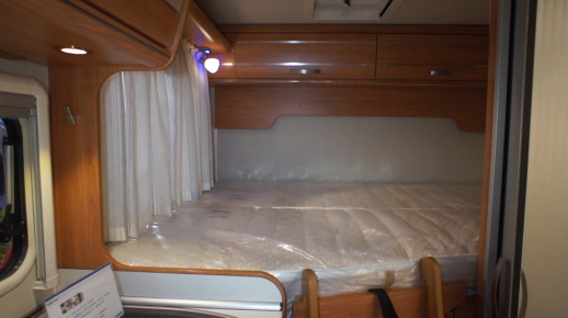 最後部のベッドルームは横置ダブルベッドで、車幅方向に就寝する。