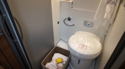 サニタリールームはキッチンの向かい、ダイネットとベッドルームの間にあり、スライドドアを開けると、カセットトイレが設置されたトイレルームが出現する。ここは完全防水で温水シャワーも標準装備されている。温水は暖房兼用のトルマ6ボイラーで沸かすが、これはガスで10リッターの高温の湯を沸かし、120リッターの給水タンクの水と混合して適温にする。120リッターが蓄えられているので、2名なら十分すぎるほどの水量だが、10リッターの高温の湯と混合すると適温の湯は20〜30リッターしか得られないので、ふんだんに使うというわけには行かない。