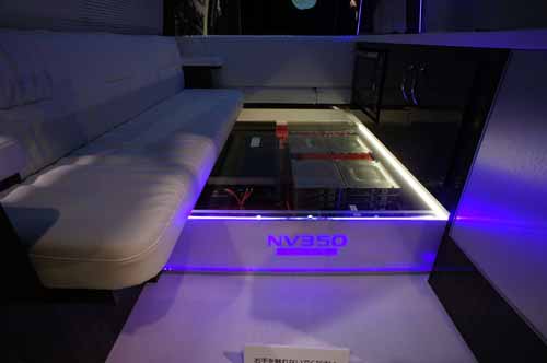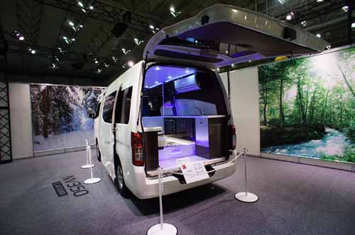 さて、日産がこれをキャンピングカーショーで展示している目的は、キャンピングカーのサブバッテリーとしてリチウムイオンバッテリーが使えないかについて、ビルダーやユーザーの意見を聞くためとのこと。展示ではNV350に大画面テレビと家庭用エアコンが装備されていた。特にエアコンはキャンピングカーに搭載したい設備の一つであるが、発電機や外部電源前提が現在の状況である。