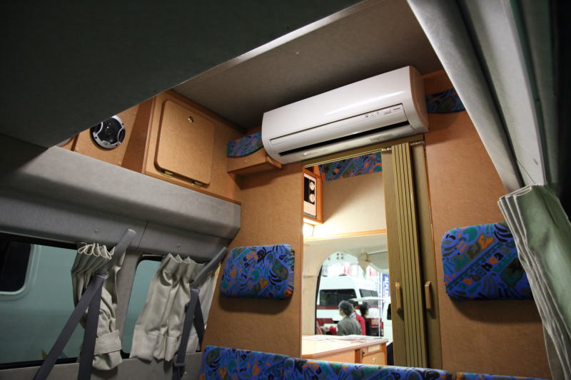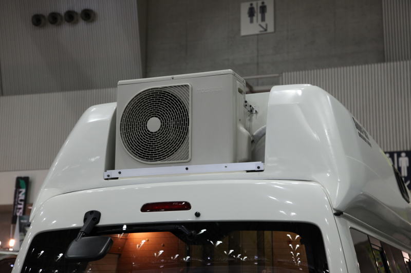 家庭用エアコンの室外機はオリジナルルーフの後方に設けられた専用スペースにはめ込まれ、うまく収まっている。 家庭用エアコンなので、車載した場合、大丈夫かという心配がわき起こるが、振動などによる故障は少ないそうである。ただし、走行中の使用は控えたほうが良いとのこと。