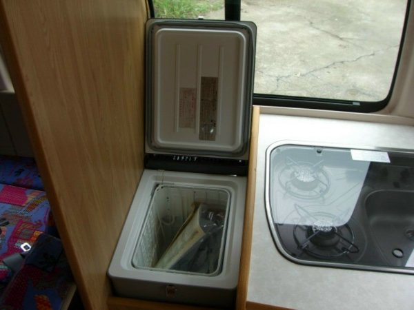 キッチンとトイレ、シャワールームは、車体の後方にまとめて配置され、アコーディオンカーテンによってダイネットと仕切られている。キッチンは2バーナーシステムコンロが装備されている。比較的小型であるが、本格的な料理をしないなら問題ないであろう。冷蔵庫は冷気が逃げにくい上開きタイプで、ギャレーの左横に位置している。左の写真では冷蔵庫がむき出しであるが、コンロと面一になる冷蔵庫の収納も可能である。(写真下) このあたりは、注文により、自由度は高いようだ。