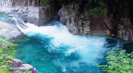 コバルトブルーの水流は美しく、途中の犬帰りの淵や牛ヶ淵ではエメラルドグリーンに色を変えます。