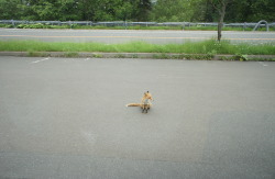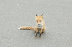 ところで、道路で寝そべっていたり、”おすわり”をしている、やけになれなれしいキタキツネを見かけるかもしれません。