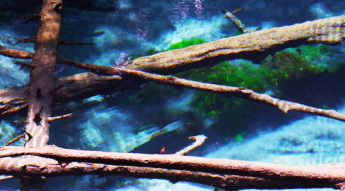 コバルトブルーの水が美しく、透明度も高いので、水中の倒木や魚がよく見えます。
