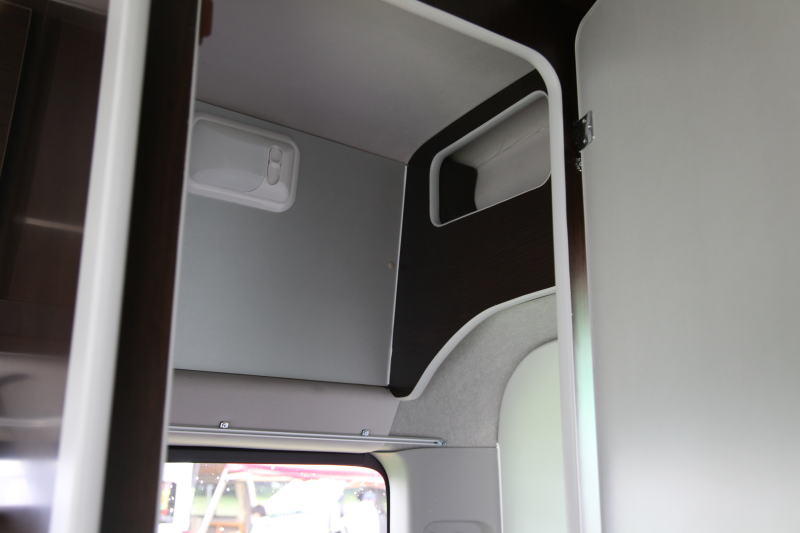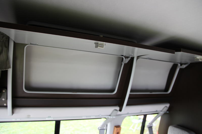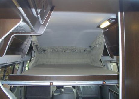 一点、プルダウンベッドで知っておく必要がるのは、プルダウンベッドを設置したら、その底面が窓の中ほど程度の高さまで降りてくることである。このためプルダウンベッドを使用しながら下のダイネットをダイネットとして使用するのは、高さ的にちょっと無理があるだろう。プルダウンベッドを設置したら、皆一緒に就寝するということになる。しかし、カップルでの就寝の場合は、ダイネットの片付けをしないままプルダウンベッドで就寝できるという