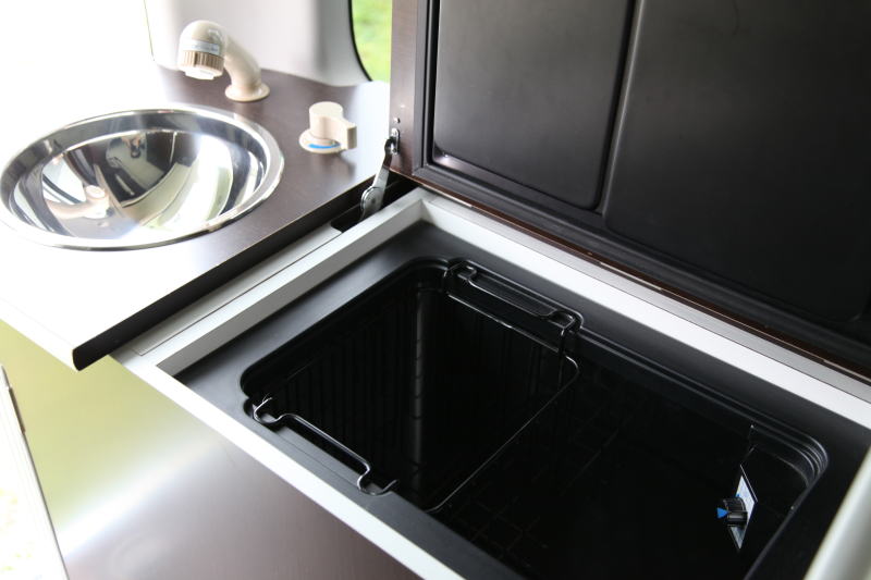 車両後方左側に集中的に配置されたギャレー(キッチン)スペースは、向かって左側にシンク、右側に冷蔵庫という配置になる。シンクはステンレス製のボウル型のものが採用されている。比較的小型のシンクであるが、必要最低限の炊事は可能だ。