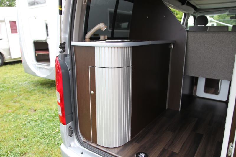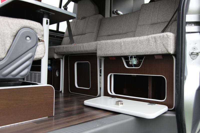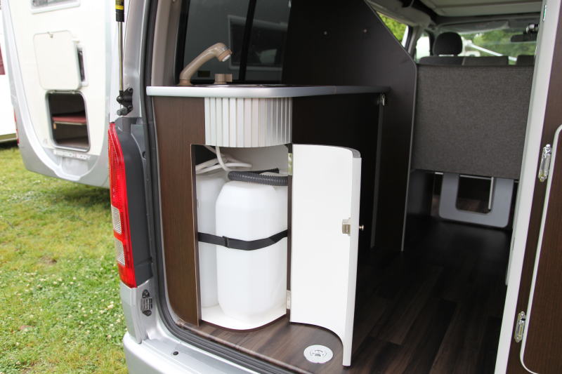 シンク下はデザイン的にもアクセントとなっているシルバーの扉のついた収納庫になっており、ここに各20リッターの給水、排水タンクが収納されている。蛇口はシャワーヘッドになっており、引き出して使うことができるので、車外でシャワーを使うことも可能だ。汚れた手足の洗浄、あるいは海水浴の後のシャワーとしても使えるだろう。