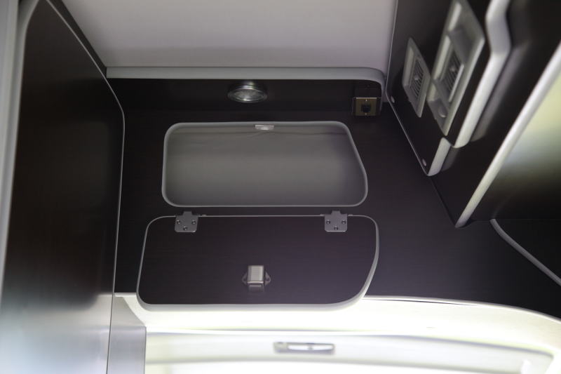 車両右側ダイネット上部と、車両左側エントランス上部にオーバーヘッドコンソールが設置されている。また、車両後部上にも小型のものが設置されている。いずれも奥行きは比較的浅いので、厚みのある荷物は収納できないが、こまごましたものの収納は可能だ。このような収納場所があるかどうかによって、車内の煩雑さが違ってくる。 収納はこのほか3列目左側シートの下にも用意されている。