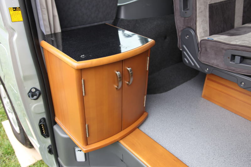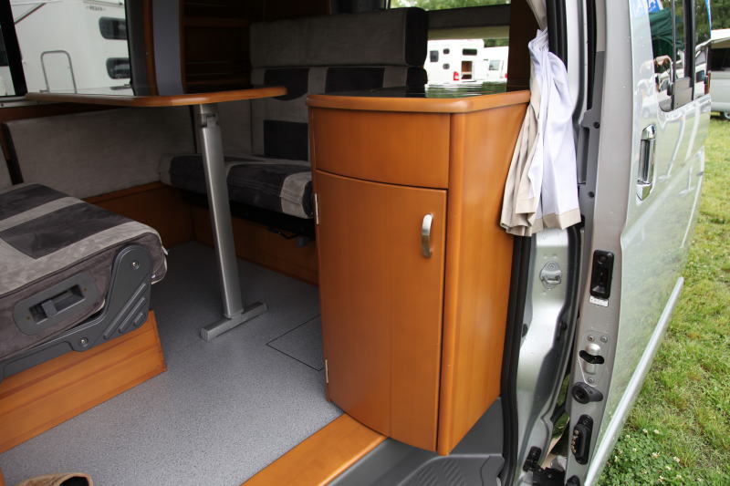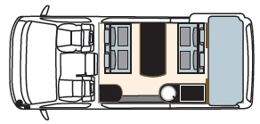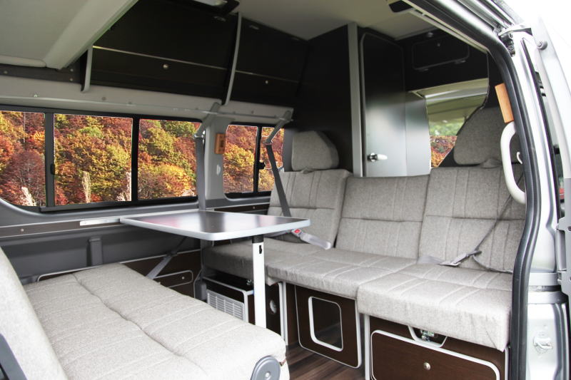 運転席の後に2人がけFASPシートがあり、走行時は前向きに2名が着座できる。目的地到着後は、この2列目シートを後ろ向き着座にすると、対面するダイネットが出現する。車両後部は二段ベッドと