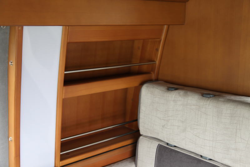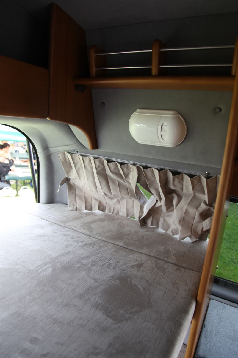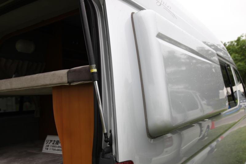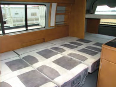 後方の二段ベッドは車幅方向に寝るレイアウトであるが、ボディー右側後方の窓の部分にエクステンションボックスを装備することにより、十分な就寝スペースとなっている。大人2名、子供2名が普通に生活できる想定で、無駄のないレイアウトであるが、カップルでゆったり使用するのにも適したパッケージングといえる。