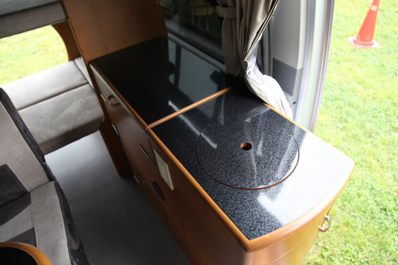 ギャレーユニットは右側にシンク、左側に上蓋式の13リッター冷蔵庫が置かれている。他車では40リッター冷蔵庫が多い中、13リッターは多少小ぶりではあるが、食材を保存しておく必要がなく、飲み物を収納しておくだけなら必要十分な大きさであろう。冷蔵庫の上蓋上面はシンク面と面一になっており、広い調理台として使える。なお、シンクには蓋がついており、この蓋をはめ込むと調理台として使えるため、シンクを使用しない場合は冷蔵庫の上部面とあわせて広い調理台が確保できる。なお、ギャレーの照明は天井のメインライトに頼ることになるが、ギャレーに立つと光が体で遮られてしまう。ギャレー上部に専用照明が欲しいところである。なお、ガスコンロ(カセットコンロ)は標準装備されているが、電子レンジの設定はない。