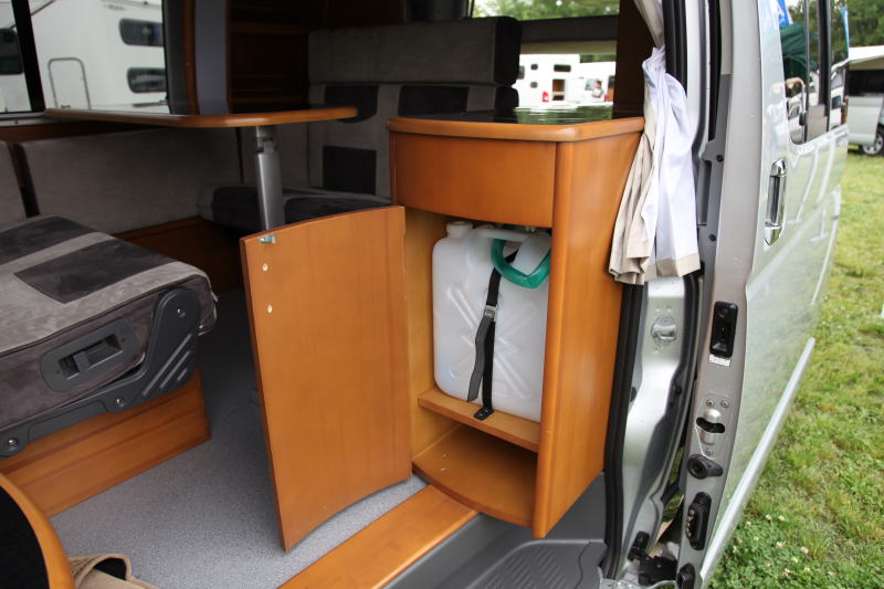 シンクの下は各10リッターの給排水タンクの収納庫となっている。エントランスに出っ張った部分に収納されているため、外で靴を履いたまま取り出したり収納したりすることができる。実はこれはキャンピングカーにとって大変便利なことで、10リッターとはいえ満タンのタンクを車内から引っ張り出し、また持ち込んでセットする度に車内と車外を出入りするのは大変な作業となる。これを靴を履いたままできるのは、極めて楽なことなのである。