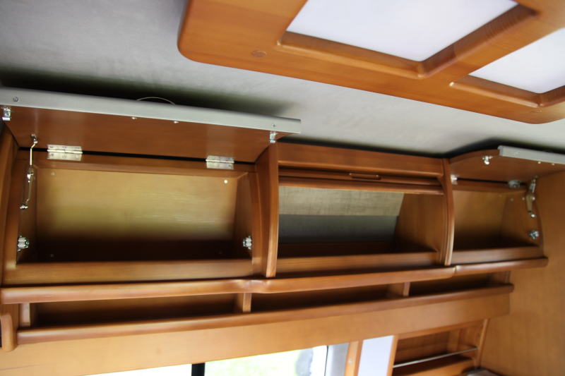 ハイルーフにしていることを生かし、天井側面にはオーバーヘッドコンソールが装備される。まず、車両右側、ダイネットの上部には3連の大型オーバーヘッドコンソールが付く。左右の収納庫の蓋は跳ね上げ式、中央の収納庫の蓋はスライド式になっており、デザイン的なアクセントにもなっている。奥行きもあり、収納力は大きい。