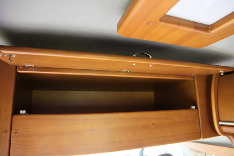 先にも書いたがギャレー上部にも収納が確保されている。上部右側にはガード付きの棚が用意されているが、デザイン的にも良いアクセントになっている。