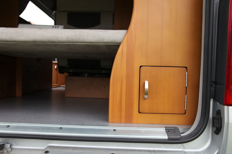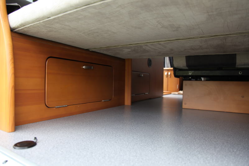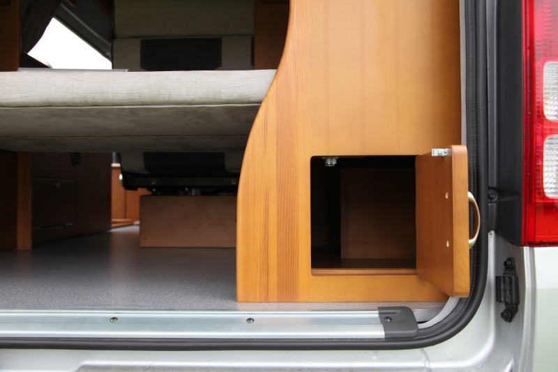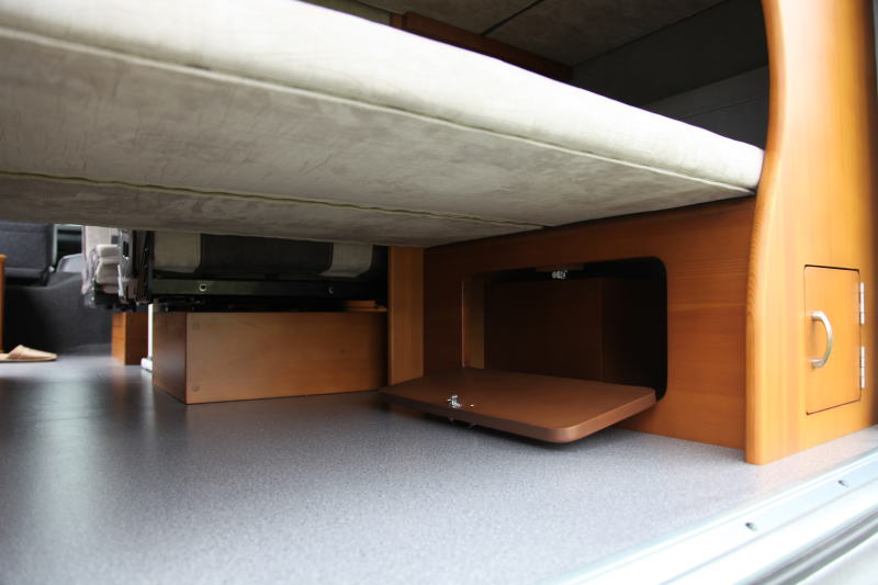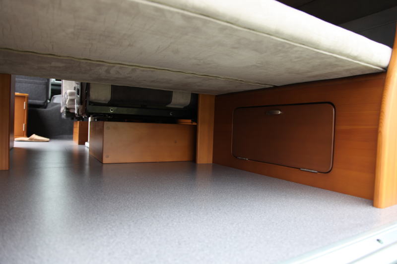 大きなものを収納する場合は、二段ベッドの下段ベッド下となる。スペースの左右には収納ボックスが用意され、蓋が付いている。左側は一部電装系が収納されており、一般収納庫としては限られているが、右側は多少のスペースが確保されている。リアハッチを開けると、小さな蓋がついており、ここからも出し入れすることができる。