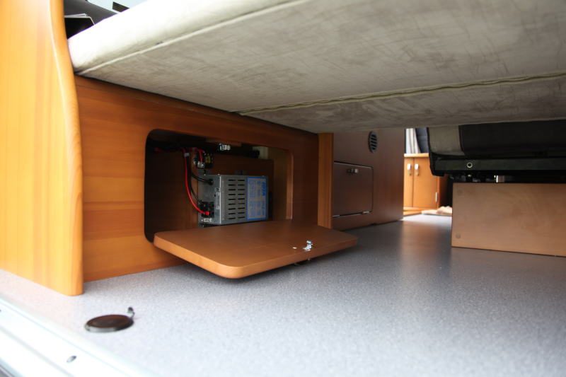 後部二段ベッド下の収納スペース左側 こちらは電装系の一部が収納されている