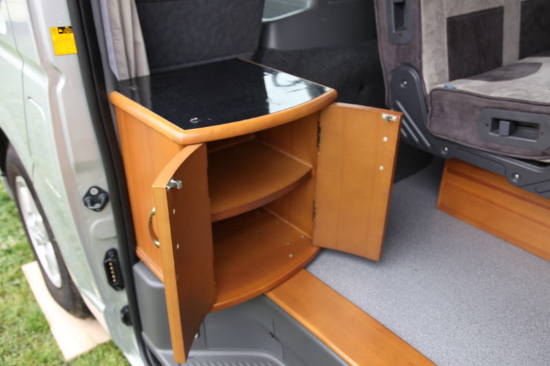 また、ルーフ前面の空間を利用して、ここもドア付きの収納庫となっている。更に、エクステンションボックスの張り出しが3列目シートの横まであるため、これを利用してダイネットのちょっとした棚が作られている。マガジンラックなどとしての使い方ができると思われるが、デザイン的にも高級感が出るとともに、実用面からも大変有用である。