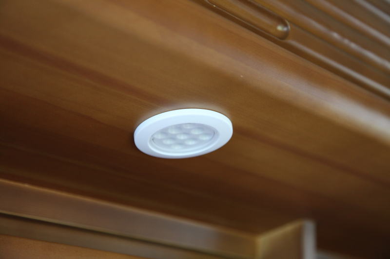 2列目FASPシートに2名、3列目固定シートに2名が普通に着座できる大きさのダイネットである。大き目のテーブルが装備されているので、食器など余裕を持って置けるだろう。ダイネット自体は特別広いわけではないが、何か広々として圧迫感がないのは、やはり天井高が高いからであろう。天井が高いということは、立って普通に歩けるということばかりではなく、このような視覚的効果もあり、長時間車内で暮らすことになるキャンピングカーにとって、極めて重要な要素である。ダイネット上部には省エネライトとして最近注目されているLEDライトも装備されている。