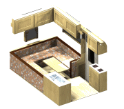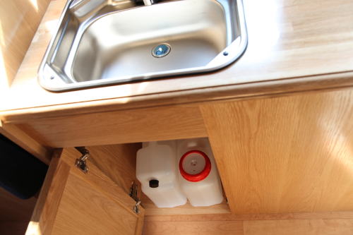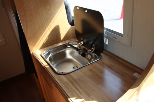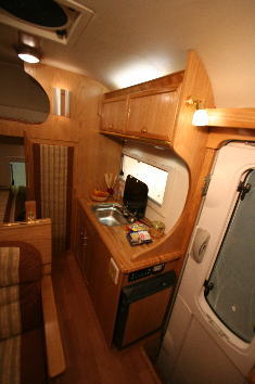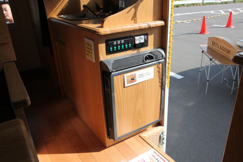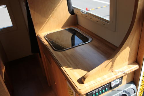 ギャレーコンソールには大型のシンクと40リッターの冷蔵庫が納まっており、冷蔵庫の上部はキッチンテーブルとして利用できる。冷蔵庫はエントランス側に扉があり、車外からでも飲み物が取り出せるようになっている。シンクの下には、各10リッターの給排水タンクが収納されている。