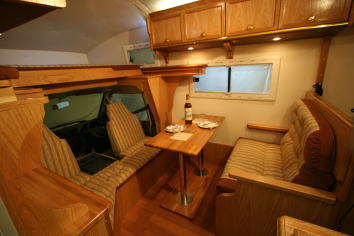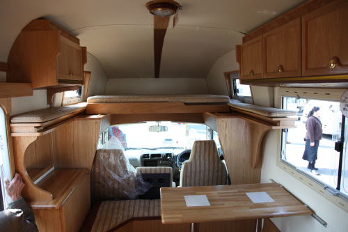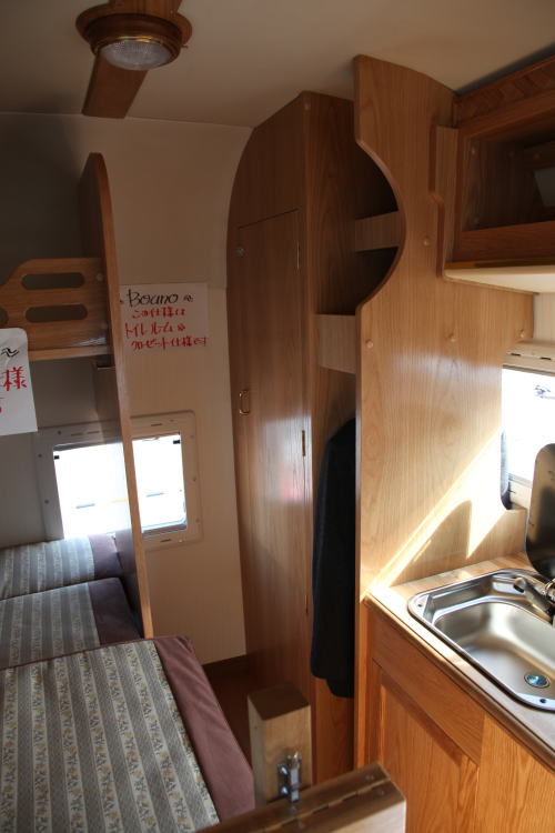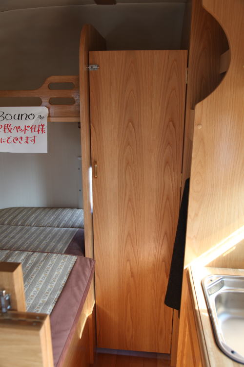 CとDのレイアウトの場合は常設ベッドがセットされる。Bの場合は2列目シートを倒しておくことにより、常設ベッドとなるが、この場合はダイネットは運転席、助手席のシートバックを利用したものとなる。バンクベッドは1,700x1,800mmあり、余裕で2名の就寝が出来る。その他B,C,Dのレイアウトにはオプションで後部に上段ベッドが追加できる。