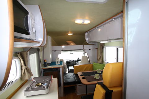 レイアウトは対面ダイネットと後部2段ベッドの構成で、ファミリーでもカップルでも使いやすい。