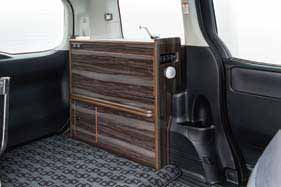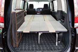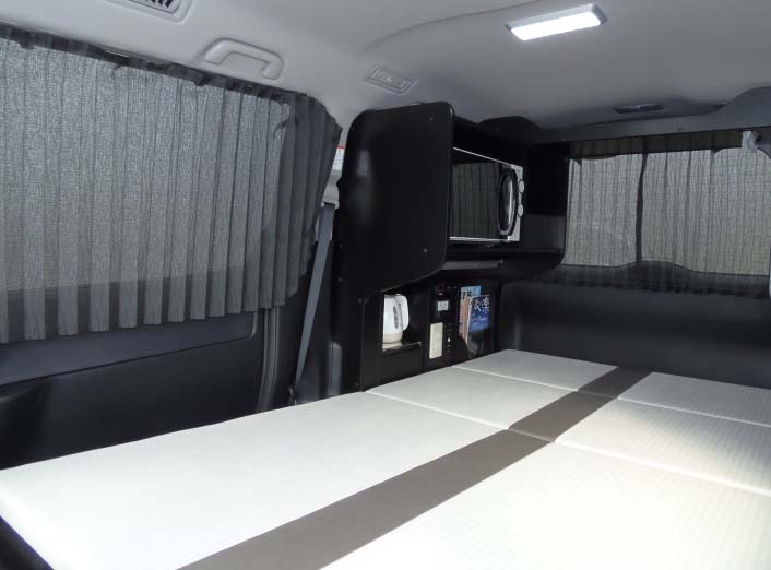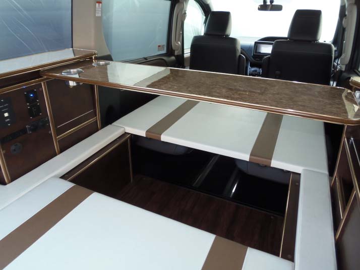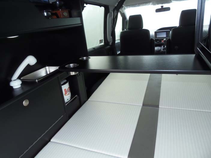 カタログには”簡易キャンピングカー”とされている通り、簡易的な組み立て式ベッドを使うタイプであるが、後部に薄型のコンソールも備えられている。