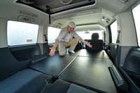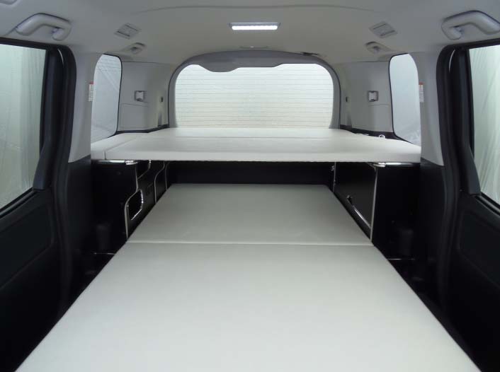 インテリアはデリカD:5のものをそのまま使用しているが、ベッドは倒したシートの上にフラットなベッドマットを乗せる仕組み。(オプション)