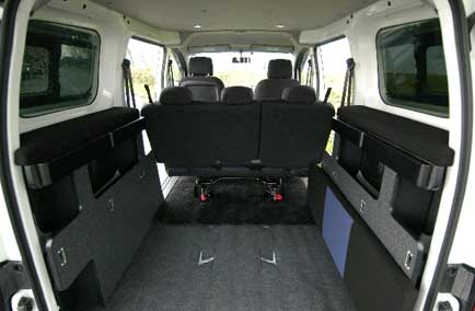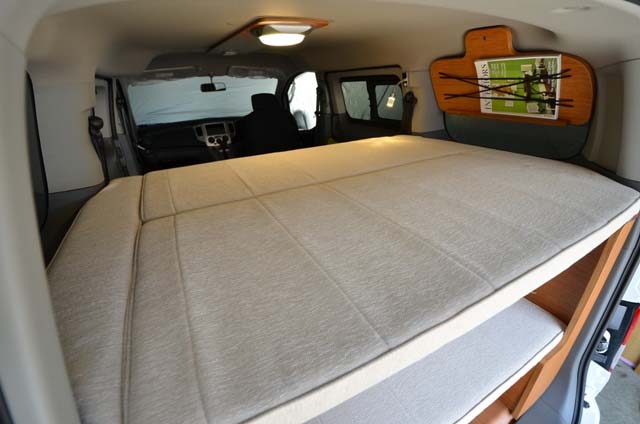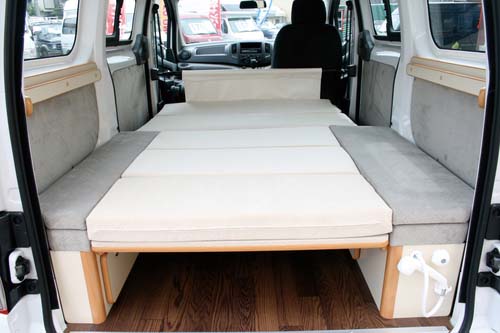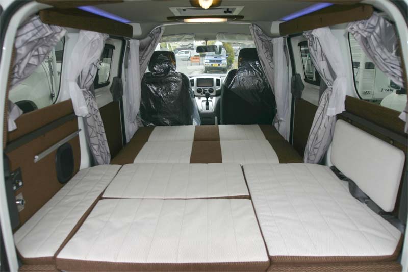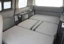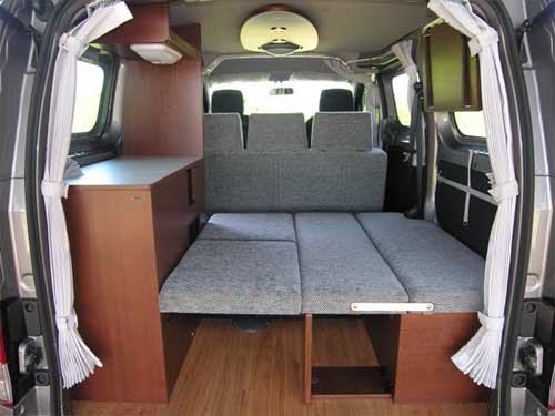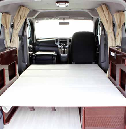 2列目シートはNV200オリジナルのものをそのまま使用し、後部にベッドボードを渡すことによりベッドをセットできる。