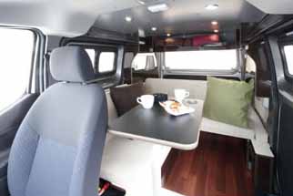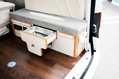レイアウトは、2列目に横置きベンチシート、3列目に前向きシートを備えたL字型のシートアレンジで、テーブルをセットするとダイネットになる。2列目と3列目シートをフラットにすると大人2名が就寝できる。