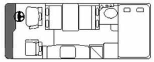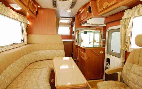 前部に対座ダイネット、その対面にギャレー、リアにハイマウントダブルベッドと跳ね上げ式の上段ベッド、ダイネットとベッドの間にサニタリールームを配置する。