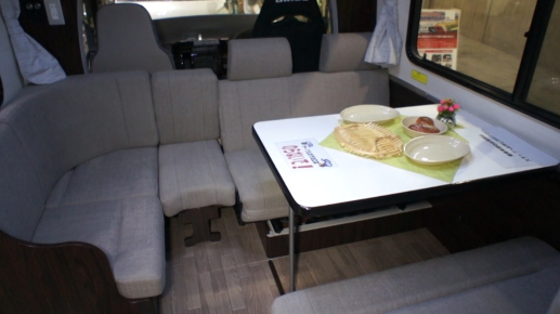 その分車内は広く、前部に広い対座ダイネットと後部に2段ベッド、中央にシャワールームとギャレーを配置する。