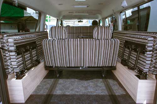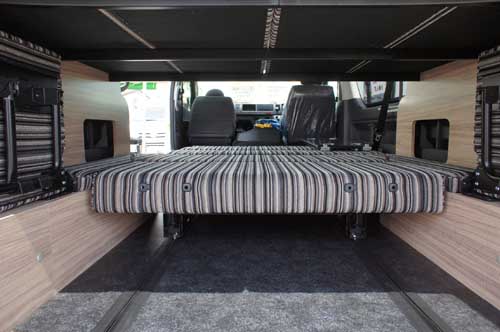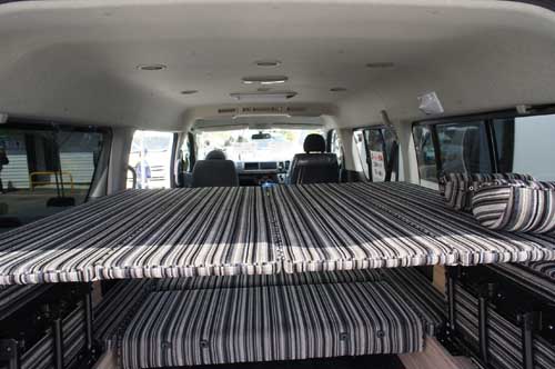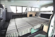 2列目シートは走行時に使用する凹凸のある面とは反対のフラットな面をベッド面として使用するため、ベッド展開時は完全なフルフラットとなる。フロアベッドは1,400x2,150mmで家庭用のダブルベッド相当の大きさがあり、大人3名が就寝できる他、2段ベッド(1,630x1,380mm)をセットすれば子供3名が就寝できるスペースとなる。フロアベッドと上段ベッドの高さ間は広く取られているので、寝返りも十分でき、上段下段ともゆったりと就寝できる。上段ベッド用のベッドボードは、使用しない場合、後部両側に収納しておくことができる。