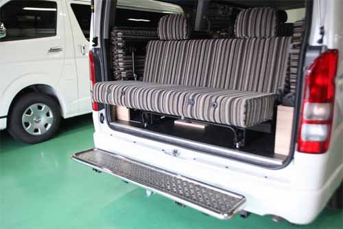 ドライブ時では2列目シートの後部が大きな収納スペースとなる。ベッドセット時はベッド下部が収納スペースとなるが、室内の最後部までフロアベッドが来ているわけではないので、最後部にはまだ余裕の荷室部分が残されている。また、2列目、3列目シートを最前部にセットすると、広大な荷室ができ、トランポ的な使い方も可能。バイクや自転車の積載もできる。この場合、3列目シートは中央を中心にして背部と着座部両方を跳ね上げた形(いわゆるバタフライ型)で収納できるため、荷室部は前後1,900mmの長さを確保できる。なお、荷室をより広く取りたい場合は、2列目シートを3列目と同じタイプに変更することができ、両方のシートがバタフライ型で収納できるため、荷室長は前後で2,150mmまで拡張できる。ただし、この場合は2列目シートは走行時でもフラットな背もたれとなる。