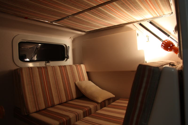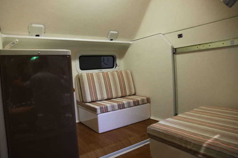 スライドアウトにより約640mm右サイドに張り出すが、これにより床面積が約1.5倍になる。スライドアウトした状態では、対面式ダイネットとギャレーが装備されるだけのシンプルなレイアウトだが、広さと高さに余裕があるため、とても軽ベースのキャンピングカーと思えない室内空間である。特に天井高が効果的にとられており、三角屋根のロフトのような感覚である。スライドアウトしたときの最大天井高は何と2,122mmもある。これだけの高さがあれば、窮屈感は全くない。