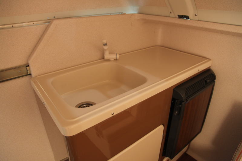 ギャレーにはシンクと冷蔵庫(オプション)が装備される。シンクは軽ベーでは異例の大きさで、ハイエースベースのキャンピングカーでも、この大きさを持つものは多くない。冷蔵庫も40リッタークラスのものを設置することができる。ギャレー前のスペースも十分確保されており、形ばかりのギャレーとなりがちな軽車両ベースのキャンピングカーと異なり、ちょっとした調理なら十分こなせるだけの装備である。