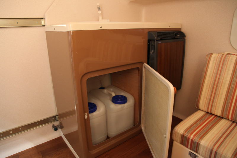 シンク下は各20リッターの給排水タンクが収納されている。ハイエースクラスのキャンピングカーでも10リッターの給排水タンクしか持たないものも多いが、これをとってみても、かるキャンが本格的なギャレーを装備していることがわかる。