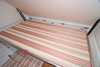 更に、かるキャンには上段ベッドが用意されている。スライドインの状態では、この上段ベッドは天井に張り付いた状態で収納されているが、スライドアウトした場合は、この部分は三角屋根の片方になる。すなわち、ベッドをセットした状態では、人間がベッドに昇降する隙間ができることになる。上段ベッドはダンパーにより、軽い力でセットでき、1900mm