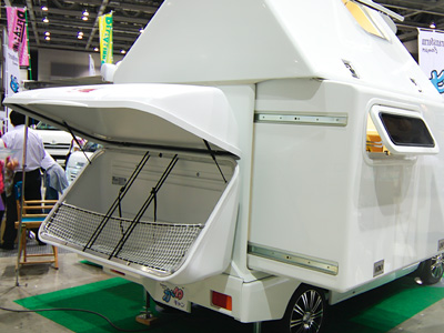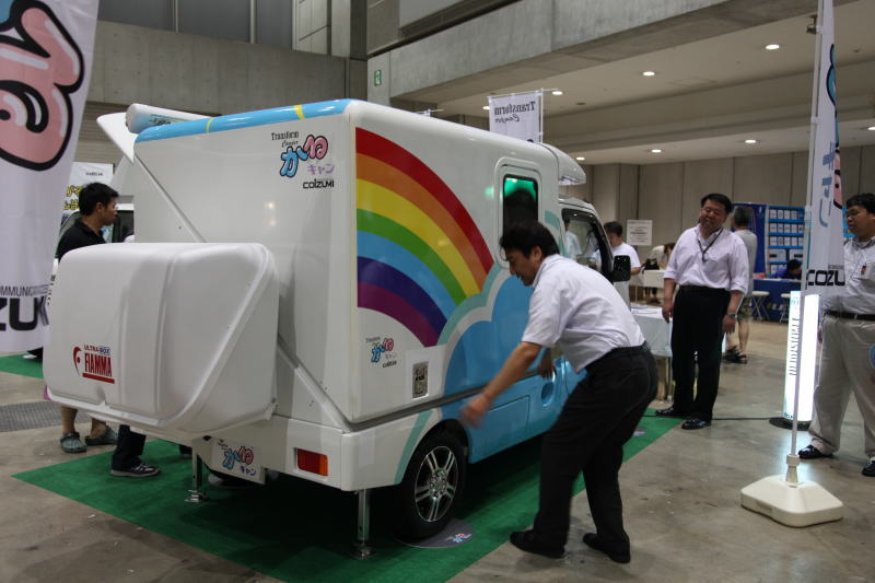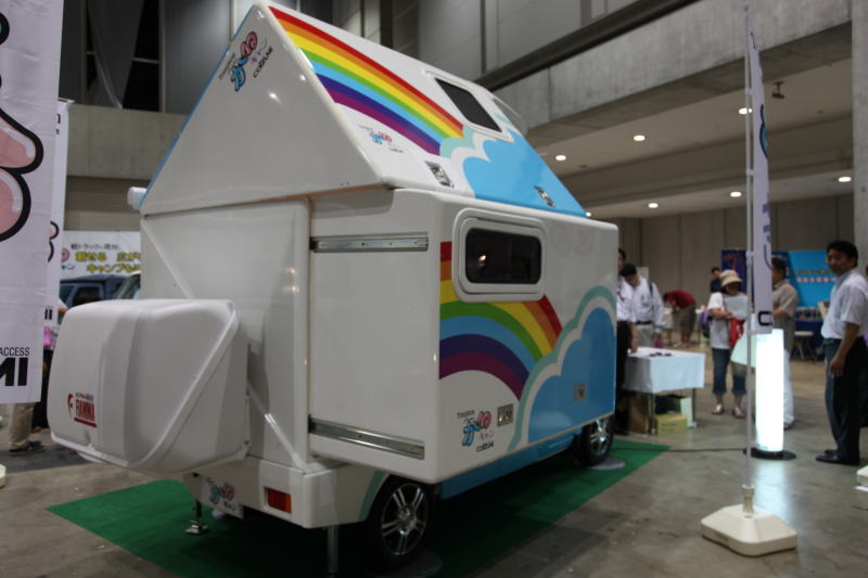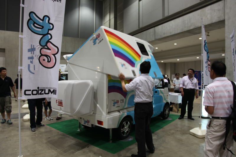 2009年7月24/25日に東京ビッグサイトで開催された東京キャンピングカーショー2009で、ひときわ人だかりが多かったのが、この「かるキャン」。初お目見えということだが、何と言っても軽トラックベースのキャンピングカーながら、居住部分がスライドアウトして室内が広がるコンセプトは実に斬新。しかも、天井も高くなり、スライドアウトした状態では、まるで三角屋根を持つコテージのような見た目となる。