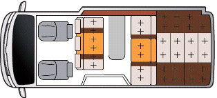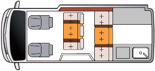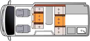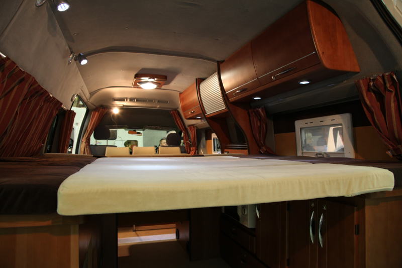 レイアウトは後部に広大な常設ダブルベッドを持ち、前部が進行方向に着座するダイネットとなっている。後部のダブルベッドは車幅方向に就寝するスタイルとしているが、このままでは1,700mm程度しかないため、右側の窓を出窓(ベイウインドーと名付けられている)として、1,850mmまで拡張している。横幅は1,400mmあり、これにより、2名の大人が楽に車幅方向に就寝できる。なお、ベイウインドー