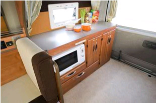 ギャレーは、後部に設置されている。進行方向左側にシンクと冷蔵庫、右側に収納庫が設置され、コンロはカセットコンロを右側収納庫の上部に置くことになる。冷蔵庫は上開きタイプの40リッターのものがオプションで用意されている。電子レンジもオプションで用意されており、これは右側収納庫に設置することになる。