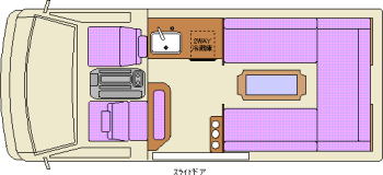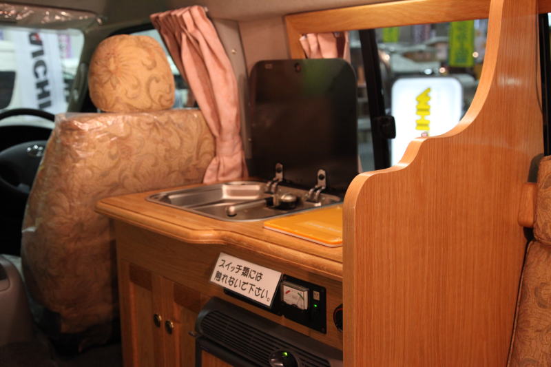 ギャレーは標準的な大きさのもので、エントランスの正面に位置している。左にシンク、右側はカセットコンロを置けるスペースになっている。右側スペースの下には40リッターの横開き冷蔵庫が設置されている。
