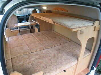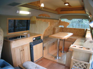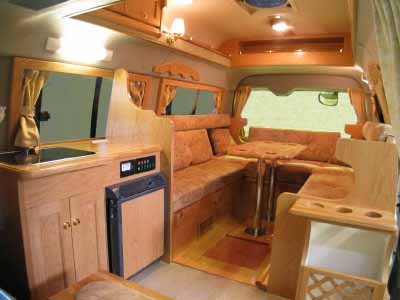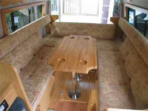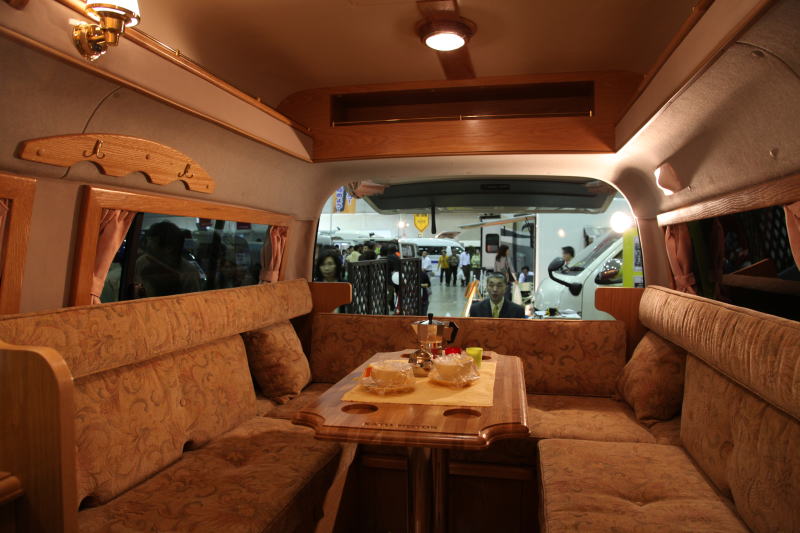 ダイネットはコの字型のレイアウトで、大人5名程度が楽に着座できる。ソファは高級感のある素材で仕上げられており、着座感も実に良い。ダイネットは簡単な操作でフルフラッとのベッドに早代わりし、大人2名が就寝可能である。オプションで二段ベッドにすることができるが、ミドルルーフのおかげで上段でも天井高が稼げるため、圧迫感は少ない。 ただし二段ベッド仕様にすると、右側の窓はふさがってしまうため、ロングトレイン特有の開放感を求めるユーザーはノーマルベッド仕様のほうがお勧かもしれない。