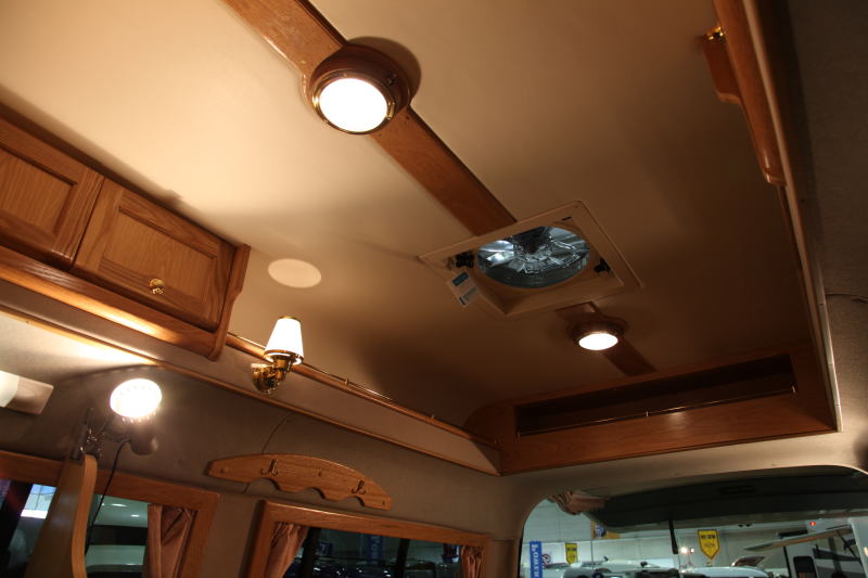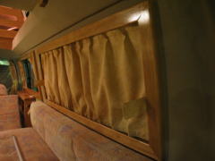 さて、カトーモーターといえば、断熱に力を入れているビルダーであるが、このロングトレインにもカトーモーターの断熱ノウハウが詰まっている。天井、床への断熱に加え、窓の断熱も装備されている。 窓には無垢材の窓枠がはめられており、これはインテリアの高級感を醸し出しているとともに、この窓枠には遮光、遮熱機能を持つインナーカーテンが付けられており(オプション)、窓との間に空気層を作り、これにより冷やされた空気を室内に入れない工夫がされている。インテリアの質感向上と断熱の一石二鳥を実現している。