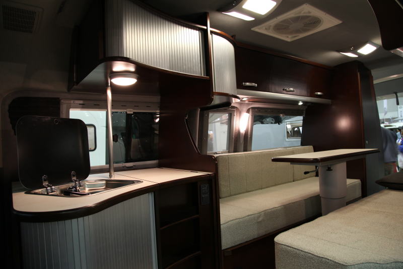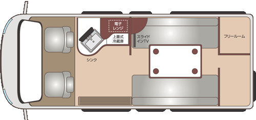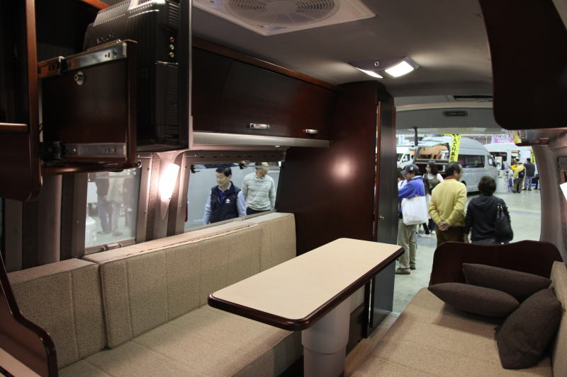 レイアウトは大きなダイネットと、前方にあるギャレーからなっている。ダイネットは進行方向に対して横方向に座る長椅子式であるが、片側に3名着座できるので、計6名が座れる広さがある。ただし、このようなクルマは6名で座るようなことは想定せず、夫婦やカップルで優雅に使用するべきであろう。