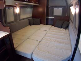 ダイネット時に背もたれとして使用していたクッションをツインベッドの間に入れると、広大なダブルベッドが出現する。夫婦と子供が就寝できる広さはあるが、やはりこのクルマの雰囲気では子供は似合わないかもしれない。