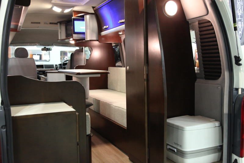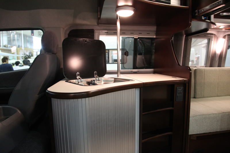実際、就寝時は余裕のあるツインベッドになり、2名での使用を前提にしたものだ。ソファの下は収納庫として使用できるが、布団をしまっておくにはちょっと役不足かも知れない。大きな収納庫が必要なユーザーは、むしろ幕張ショーで発表されたバーデンが良いかもしれない。こちらは、リア常設ダブルベッドが設置されており、その下は広大な収納庫になっている。