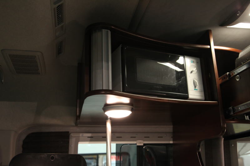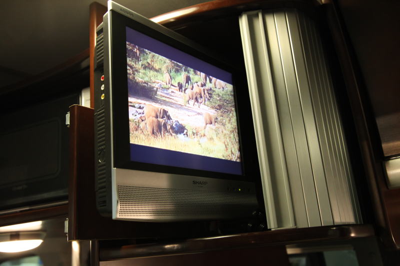 液晶テレビも装備されているが、これまたオーバーヘッドコンソールにうまく収納されており、同様にジャバラ引き戸を開けて横にスライドさせると、出てくる仕掛けになっている。ソファに寝そべってテレビを見るように想定されていると思われるが、ソファの頭部分がリクライニングするとなお楽な姿勢でテレビが見られるのではないかと思われた。