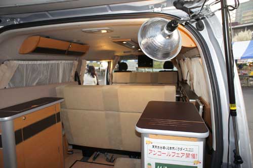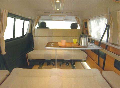 車幅いっぱいの幅を持ち3名掛けできる2列目シートと、ゆったり2名掛けできる3列目シートを対座させてダイネットスペースとしている。テーブルは片側足で、右側面のレールに引っ掛けて支えるが、前後にスライドさせることができるので位置が自由に変えられる。2列目シートと3列目シートはそれぞれ床のレールに従って前後にスライドさせることができるので、3列目シートを後にスライドさせると余裕十分の足元スペースを確保できる。ただし、ギャレーや冷蔵庫は車両後方にあるので、これらにアクセスする場合は、3列目シートのサイドから後部へ回り込む必要がある。また運転席、助手席へ行く場合も、2列目シートを倒すか、一旦車外に出る必要がある。