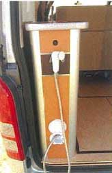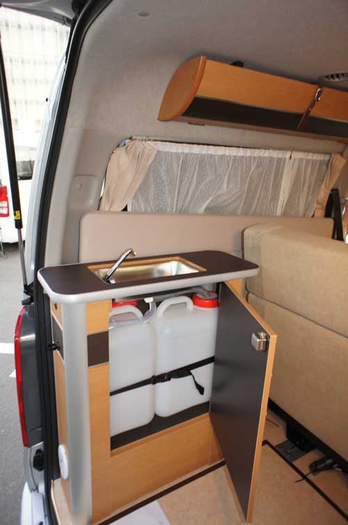 車両後部にはギャレーコンソールと対面して冷蔵庫用のコンソールが設置される。本格的な調理をする想定ではないので、コンパクトなギャレーだが、水回りが装備されていることは手洗いや洗面に便利である。側面にシャワーセットが設置されているので、海水浴の後のシャワーを使ったり、ペットの足を洗うなどといったことも可能だ。どちらも上部はテーブルカウンターになっており、ものを置くことができる。シンクはギャレーコンソール上部の蓋を取ると現れ、下には各13リッターの給排水タンクが収納されている。冷蔵庫は20リッターで上蓋式のため冷気が逃げにくい。